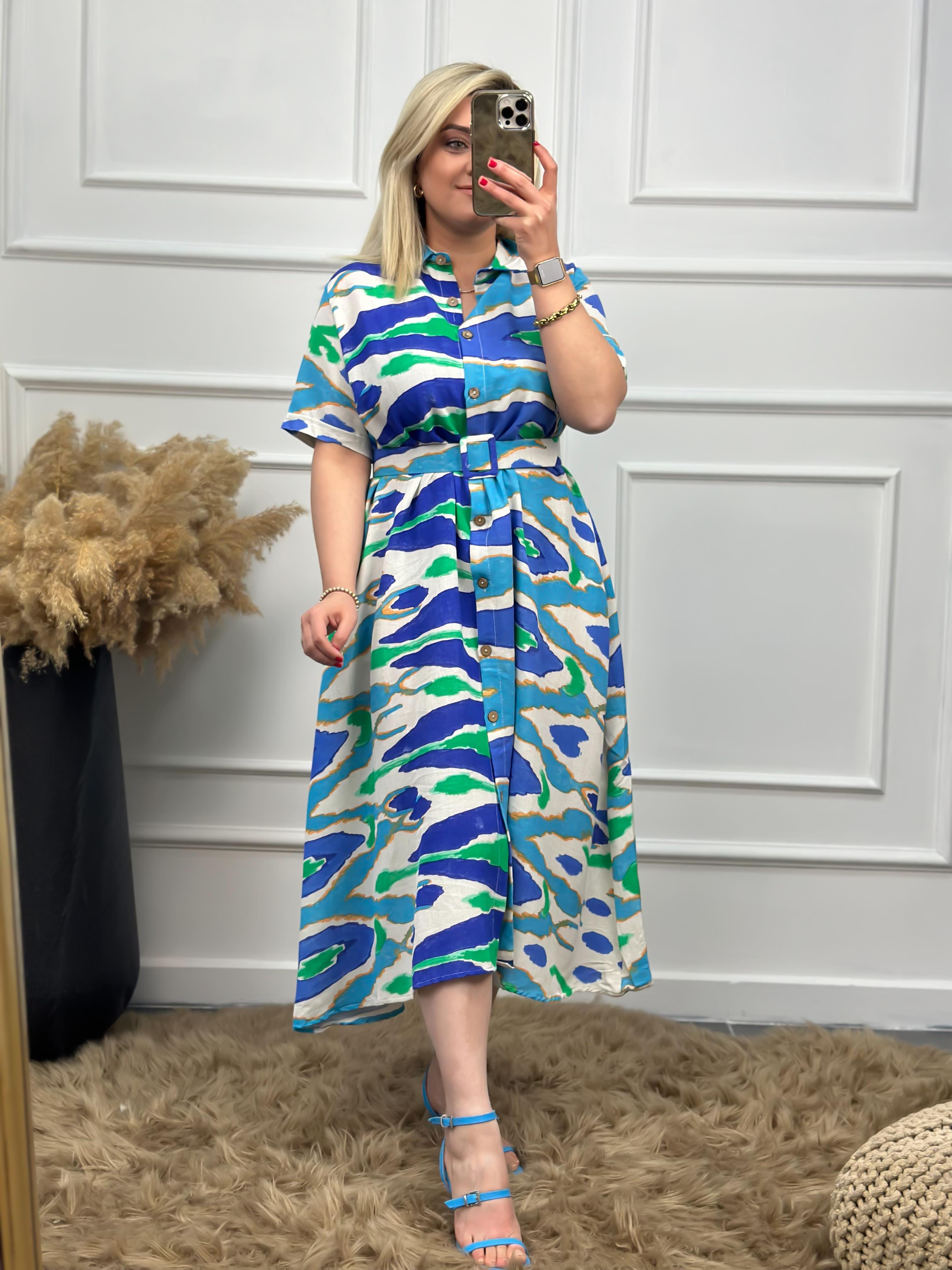 Desenli Kemer Detay Gömlek Elbise MAVİ-23YELB000013
