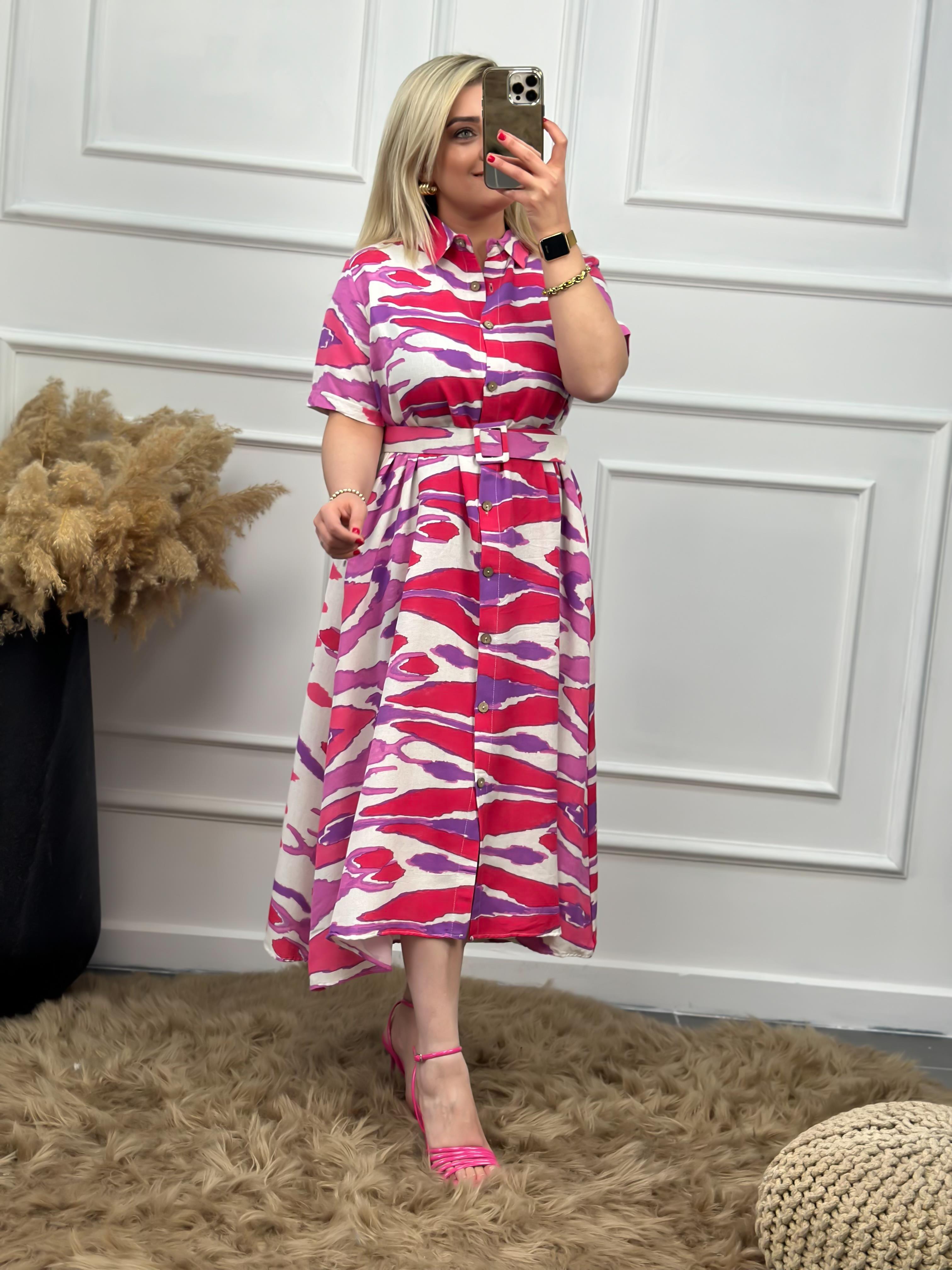 Desenli Kemer Detay Gömlek Elbise PEMBE-23YELB000013