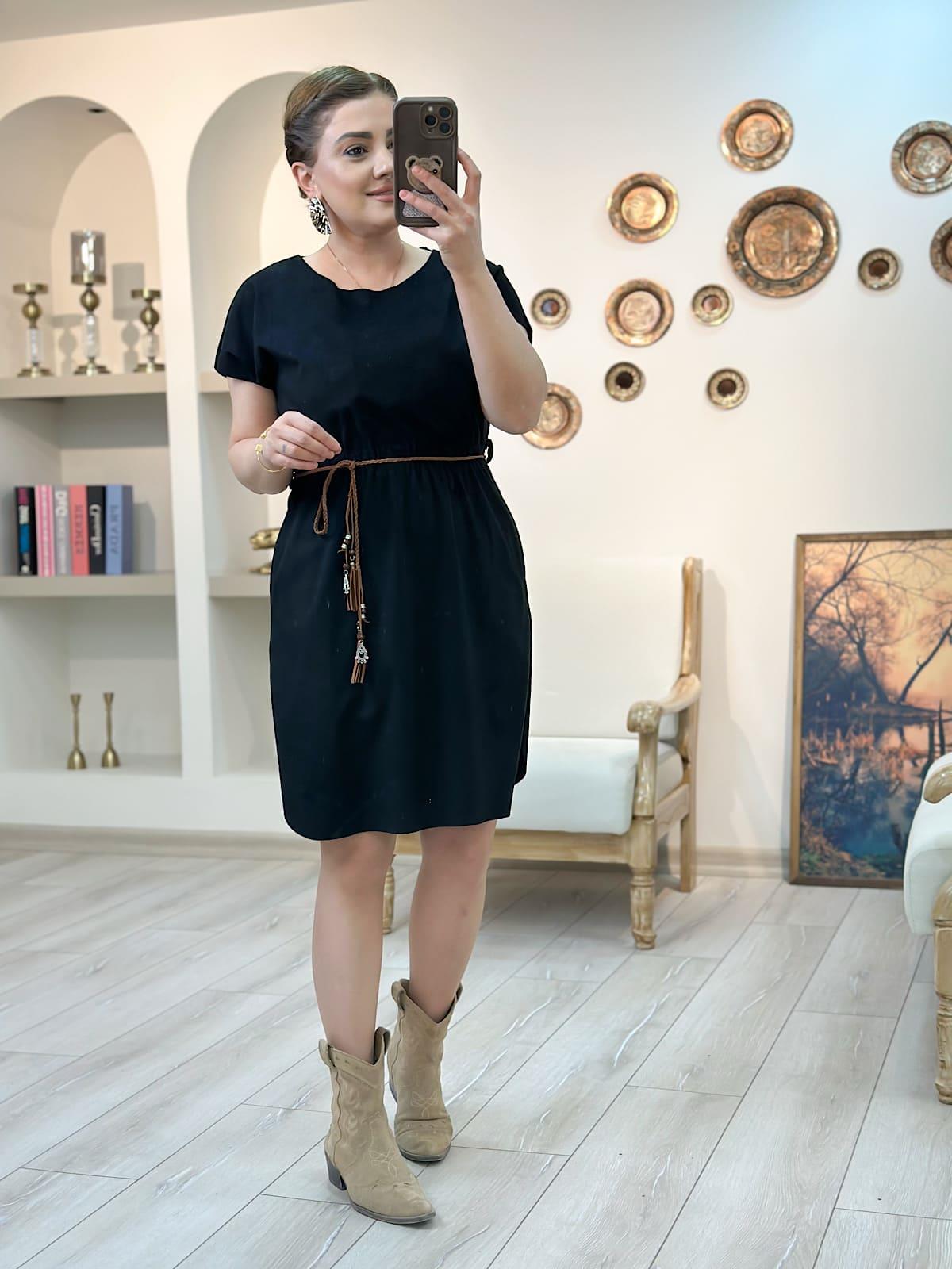 Kemerli Kısa Kol Nubuk elbise SİYAH (23YELB000163)
