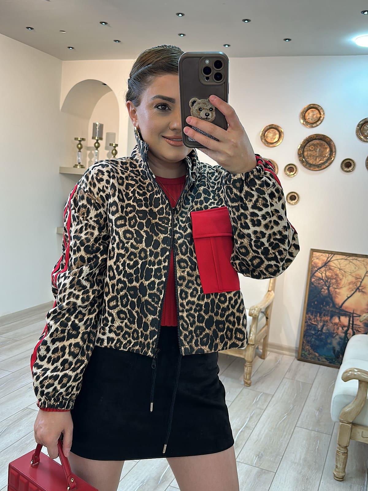 Leopar  Kırmızı Biye Geçişli Fermuar Detaylı Ceket KAHVE-23YDIS000015