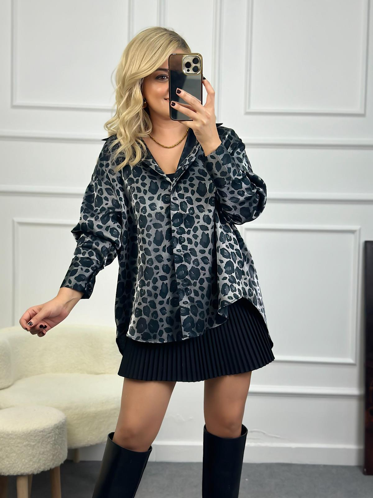 Yarasa Kol Saten Leopar Gömlek SİYAH-23MeDIS00009