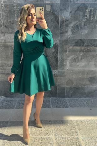Yuvarlak Yaka Önü Çapraz Uzun Kol Kiloş Kısa Elbise ZÜMRÜT YEŞİLİ (23MeELB00005)